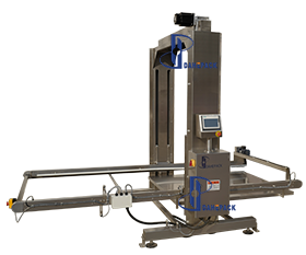 人工用地牛將整托盤空罐運至指定位置(碼垛方式為罐口向上),點動啟動按鈕,系統會自動通過光電檢測確定空罐托盤高度,根據后面緩存皮帶對罐子的需求,將一層空罐通過刮板推至緩存面板上,然后再調整上下高度與后道的緩存皮帶進行高度對接,再將空罐送至緩存皮帶上待用