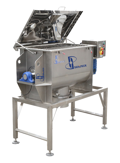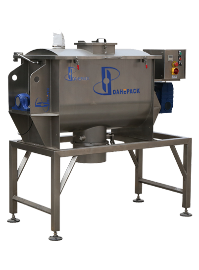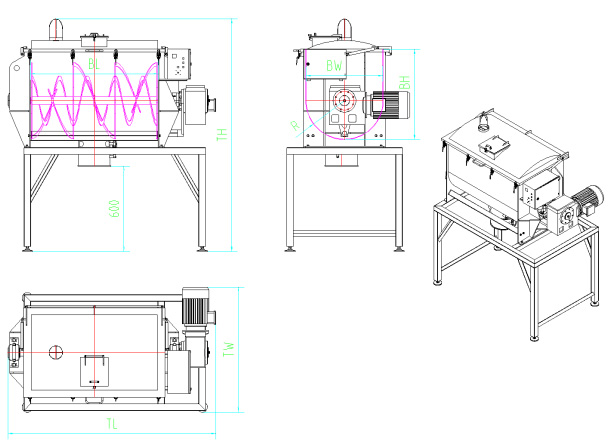 該機型為臥式筒體,單軸雙螺帶對稱分布結構。混合機筒體為U型,在頂蓋或筒體上部有進料口,根據用戶需要其上可裝噴霧加液裝置。筒體內裝有單軸轉子,轉子是由軸、橫撐及螺帶組成。